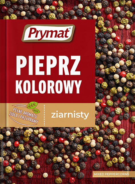 Pieprz kolorowy ziarnisty Prymat stanowi starannie dobraną mieszankę czarnego, białego, zielonego i różowego pieprzu. Barwa ziaren pieprzu zależy od momentu ich zbierania, a także od późniejszych zabiegów, którym są poddawane. Pieprz kolorowy ziarnisty Prymat to kompozycja ostrzejszych i łagodniejszych nut smakowych, które zadowolą najbardziej wymagających smakoszy. Nadaje potrawom nie tylko wyszukany charakter, ale także podkreśla ich atrakcyjny wygląd.