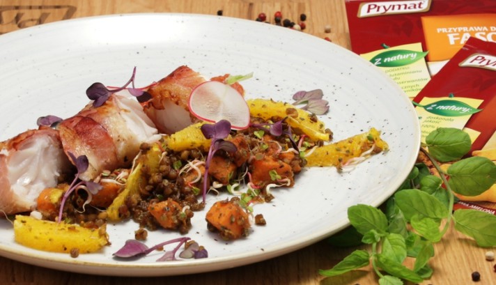 Ryba zawinięta w plaster boczku bądź szynki to w kuchni połączenie spotykane coraz częściej, lecz wciąż jeszcze uchodzące za nieco ekstrawaganckie i odważne.